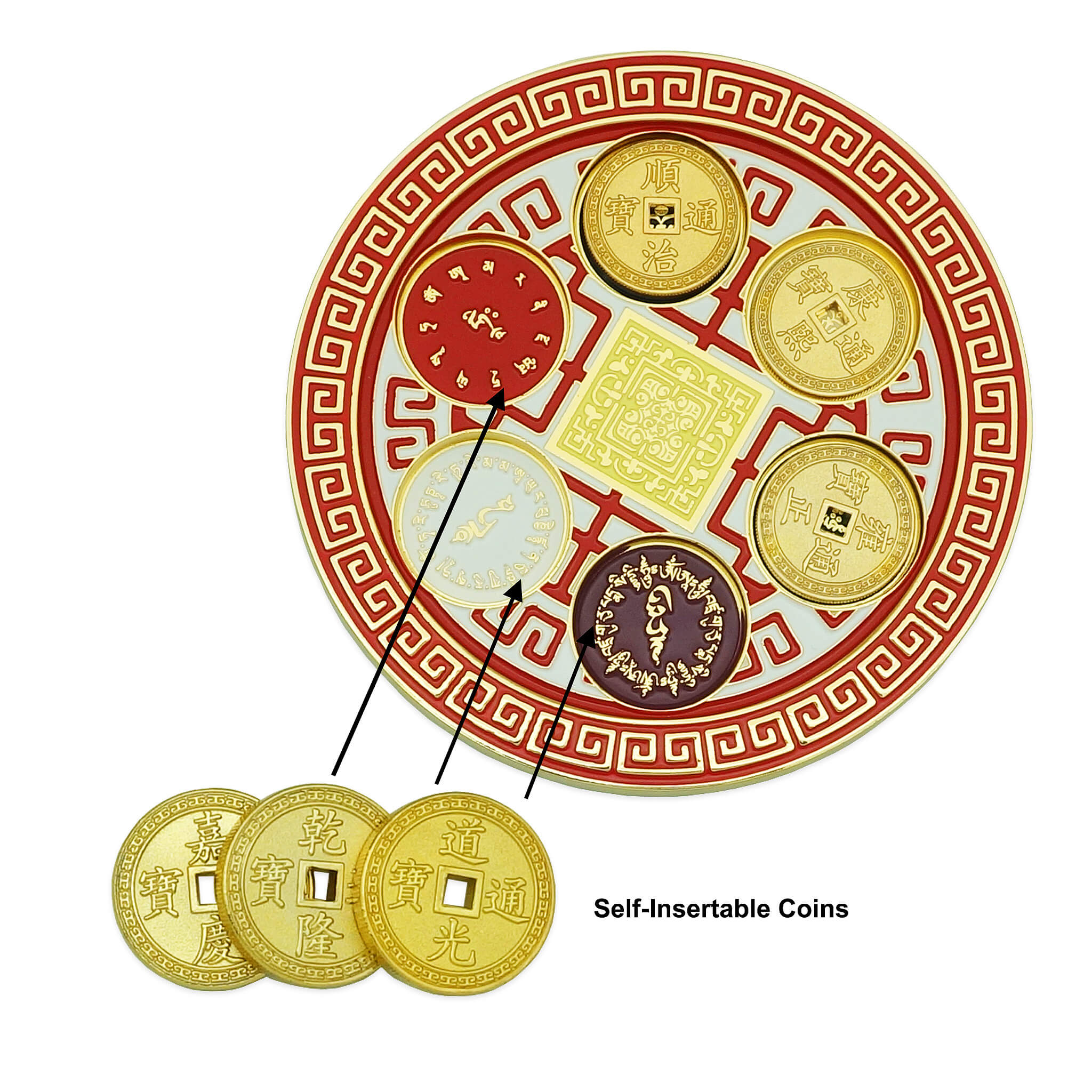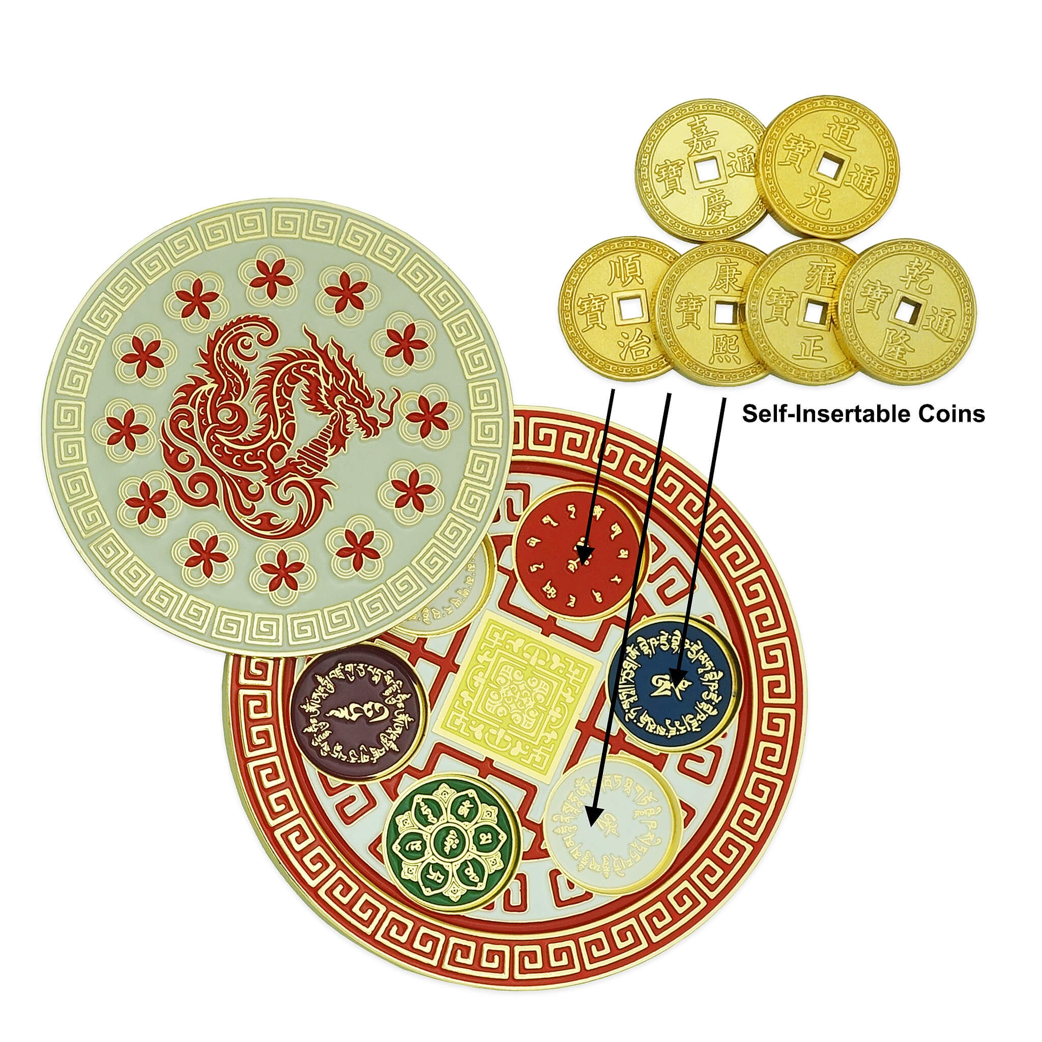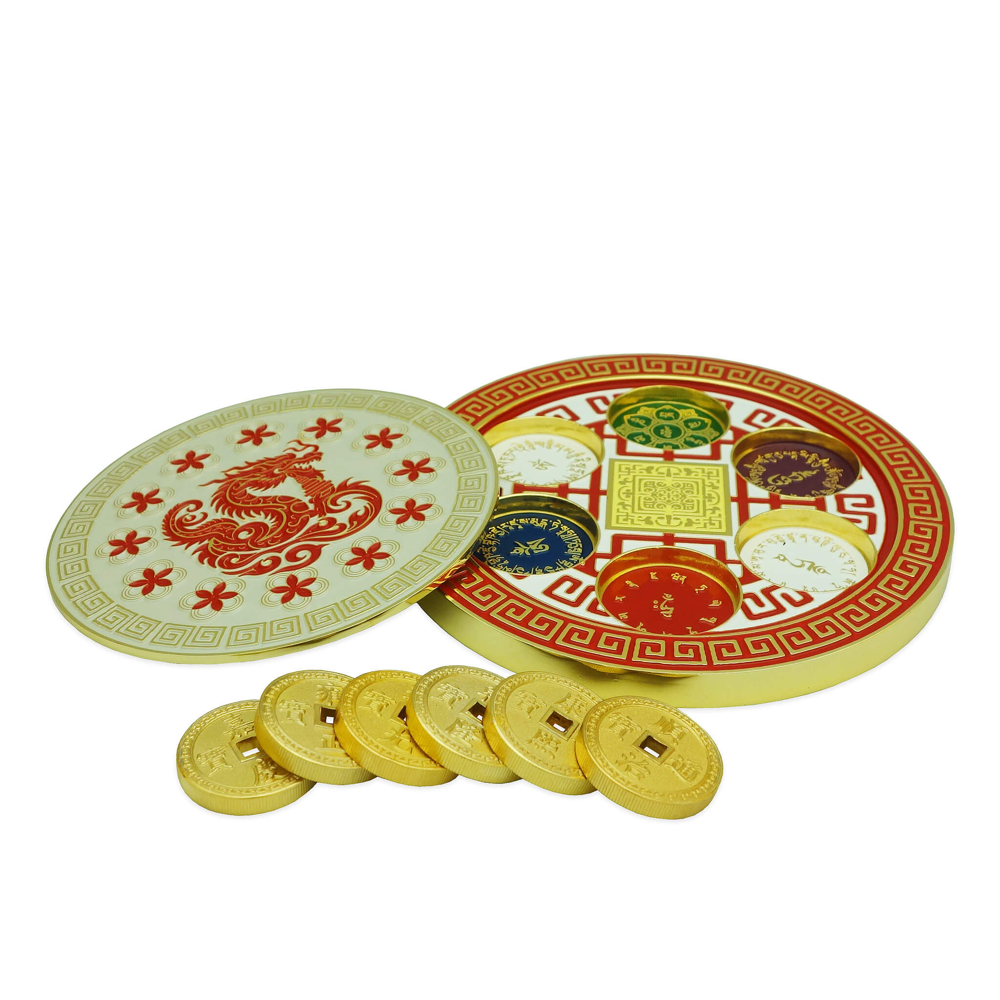 At its core is a Celestial Dragon Holding a Stupa, a sacred symbol of protection, authority, and cosmic power. Beneath this cover lies the hidden heart of the array—the Yellow Heaven Seal and Six Emperor Coins, seated securely within six concaves, each inscribed with a Powerful Protective Mantra. When these sacred components come together, they form a supercharged enhancer and cure, far surpassing the effect of using Six Emperor Coins alone. This optimized combination amplifies Heaven Star #6 while simultaneously neutralizing malevolent earth-based energies from #2 and #5 with remarkable strength.