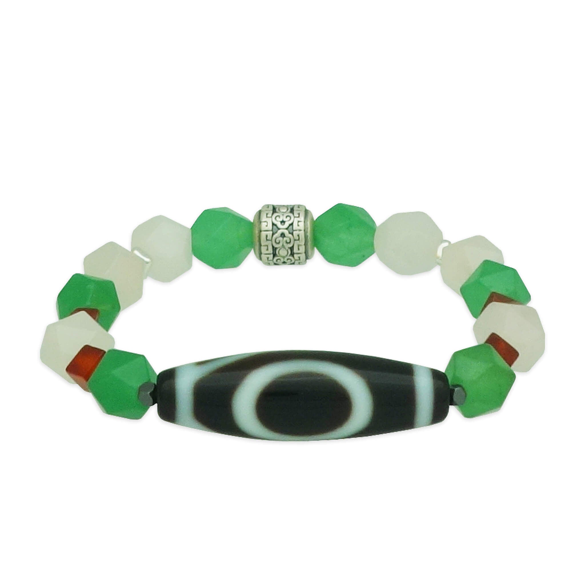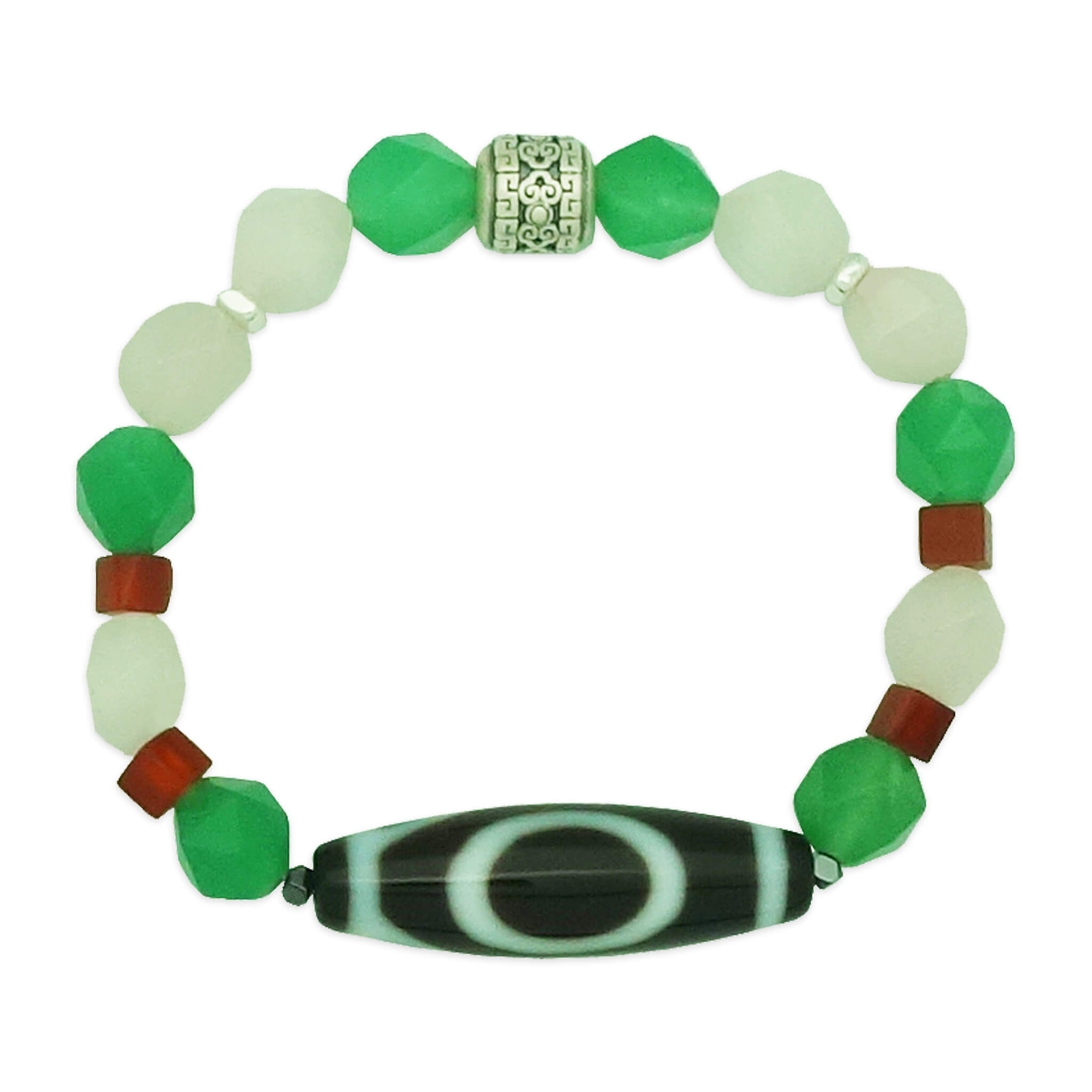 A beautifully refined bracelet centred on the empowering 1 Eye Dzi, this piece is thoughtfully paired with faceted White Jade, faceted Green Aventurine, Red Agate and a silver bead engraved with the Ru Yi symbol. The 1 Eye Dzi is traditionally cherished for awakening one’s innate talents, sharpening intelligence and unlocking personal potential, making it especially beneficial for children, youths and anyone pursuing academic excellence or skill development. It is believed to brighten the mind, enhance focus and inspire creativity, allowing the wearer to excel naturally in their goals. This Dzi is also treasured for attracting success, smooth advancement and favourable outcomes, making it ideal for those preparing for examinations, competitions or any important endeavour requiring confidence and clarity. With its vibrant green and white tones symbolising growth and purity, this bracelet is an excellent choice for anyone who wishes to strengthen their abilities and move toward achievement with greater ease.