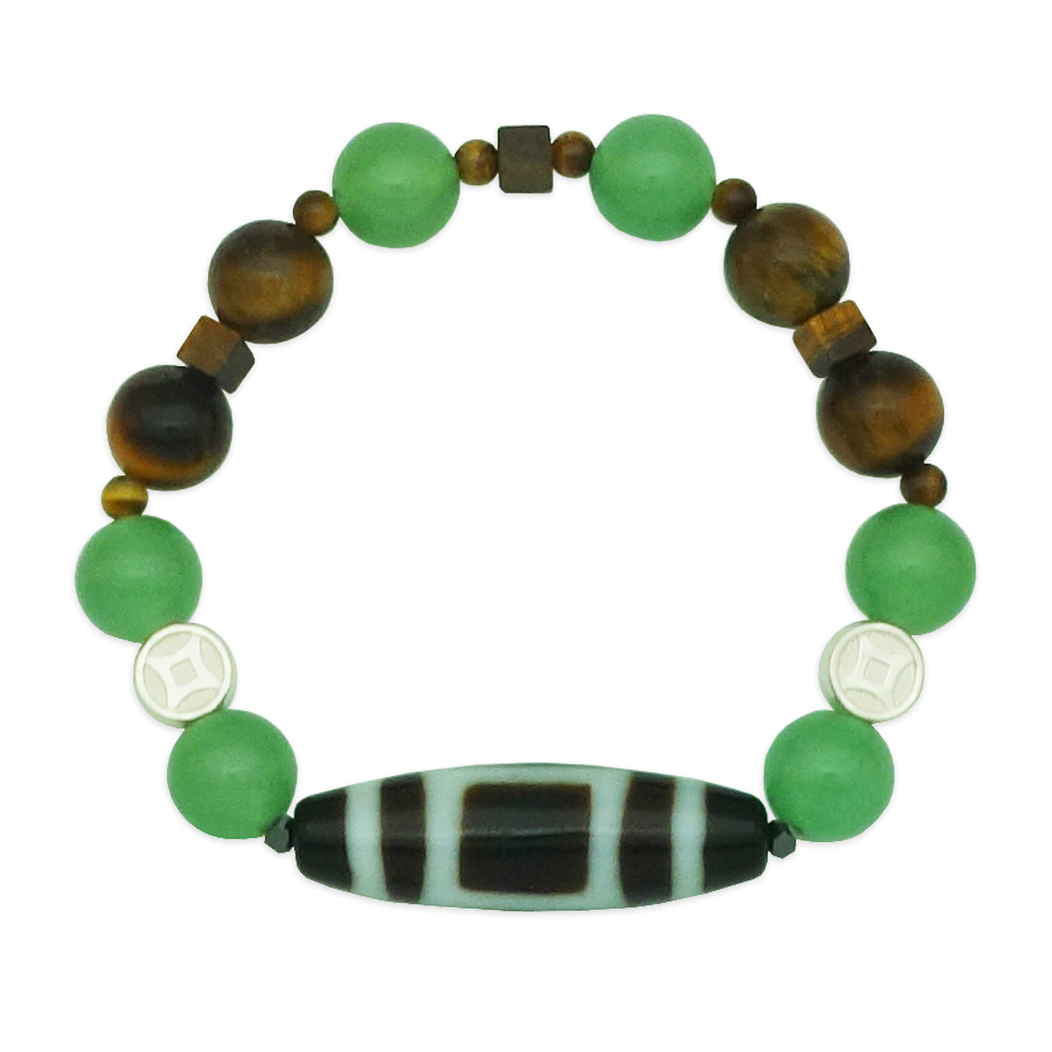 A captivating designer bracelet centred on the powerful Heaven and Earth Dzi, this piece represents the perfect alignment of celestial blessings and earthly stability. Beautifully paired with Green Aventurine, Brown Tiger Eye and two elegant silver i-ching coin beads, it embodies harmony, growth and protective authority. The Heaven and Earth Dzi is traditionally treasured for creating balance between Heaven, Earth and Mankind, a condition believed to elevate one’s overall luck and smooth life’s important pathways. Wearing it is said to strengthen personal grounding, attract supportive forces and open doors to opportunities that lead to progress, success and long term stability. The refreshing green tones symbolise growth and renewal, while the golden brown Tiger Eye reinforces courage and steady advancement. This stunning bracelet is ideal for those seeking stronger life stability, better outcomes and a powerful boost of upward energy in career, endeavours and personal pursuits. A meaningful choice for anyone wishing to enhance their fortune and move confidently toward a more prosperous future.