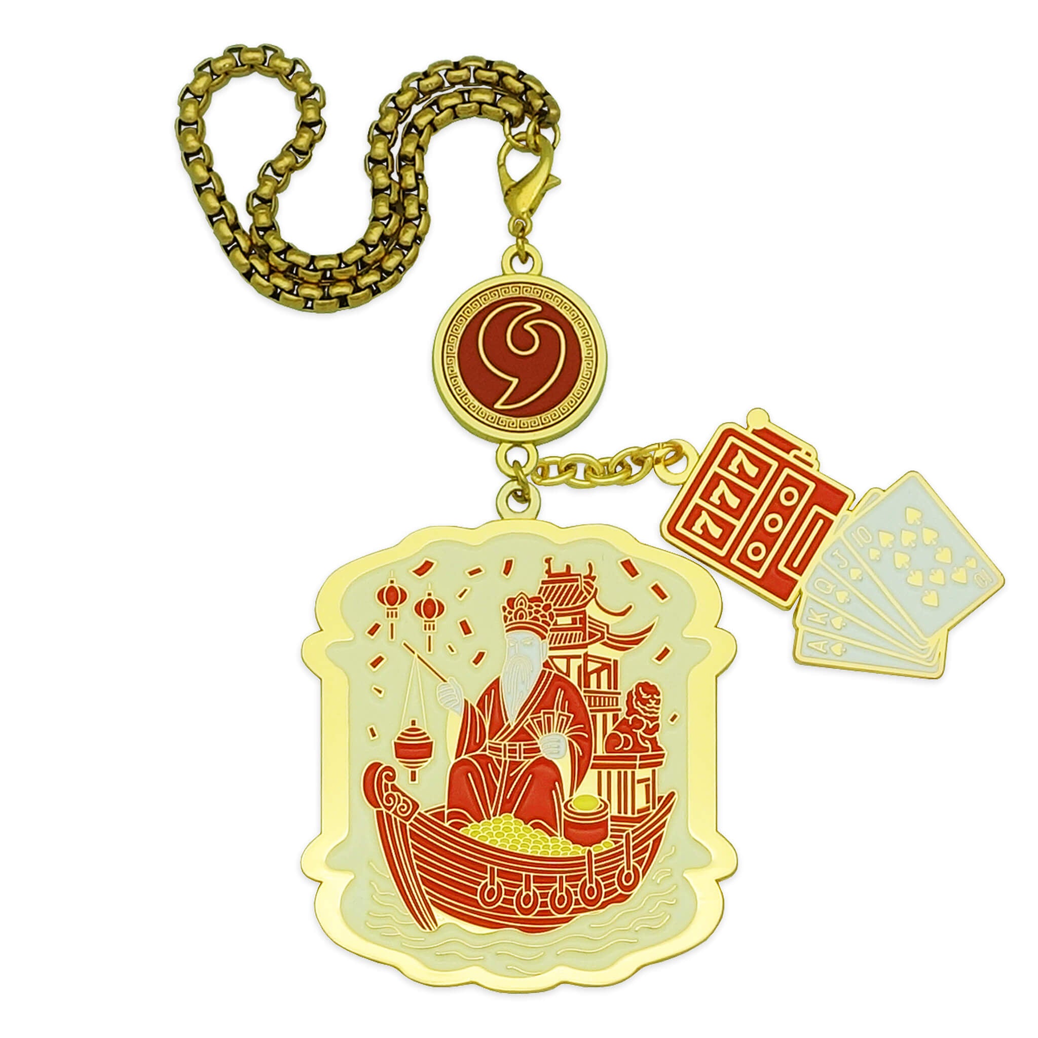 Attached to the amulet are beautifully crafted casino-themed charms — a slot machine with “777” and a winning hand of poker cards — signifying victory, jackpots, and favourable outcomes whenever chance or luck is involved.