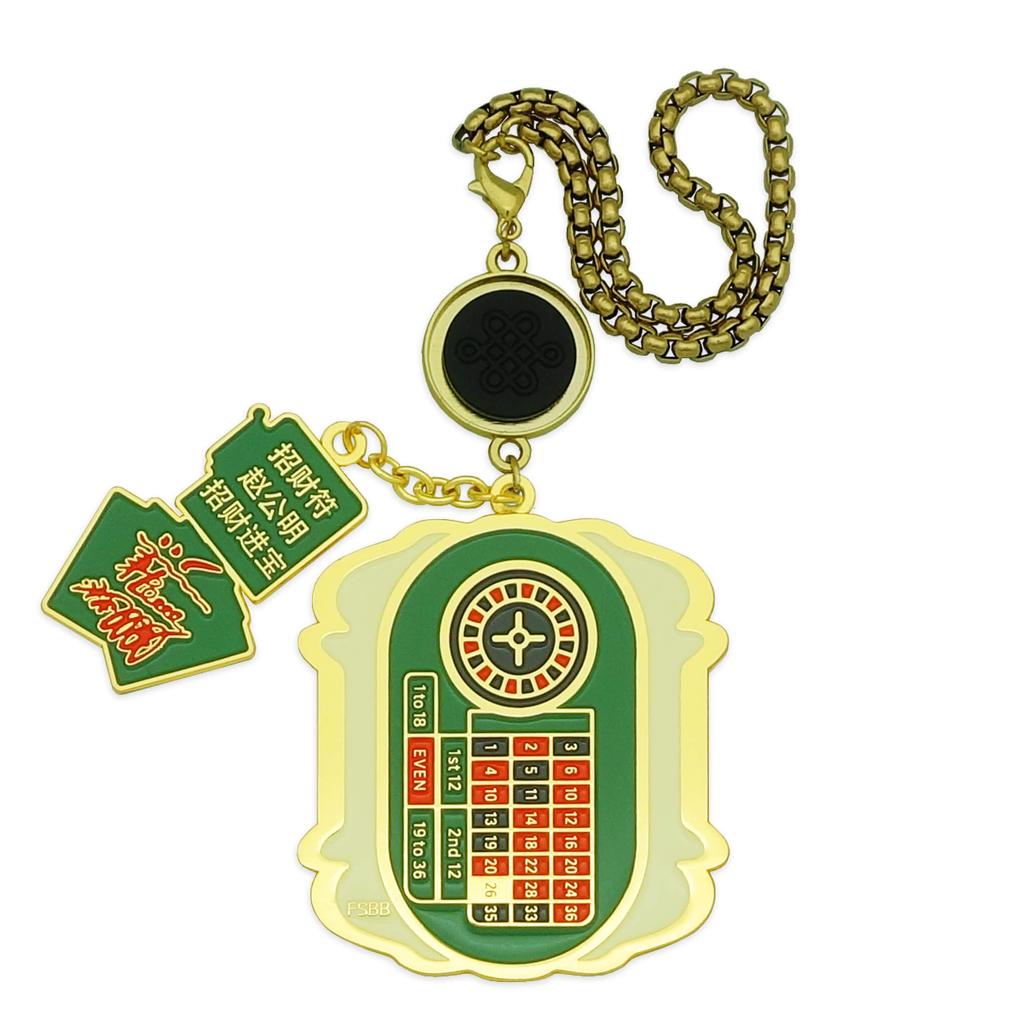 On the reverse side, the amulet features a roulette wheel and Taoist talisman inscriptions in high-quality enamel. These charms serve as spiritual conduits, drawing cosmic forces that:
