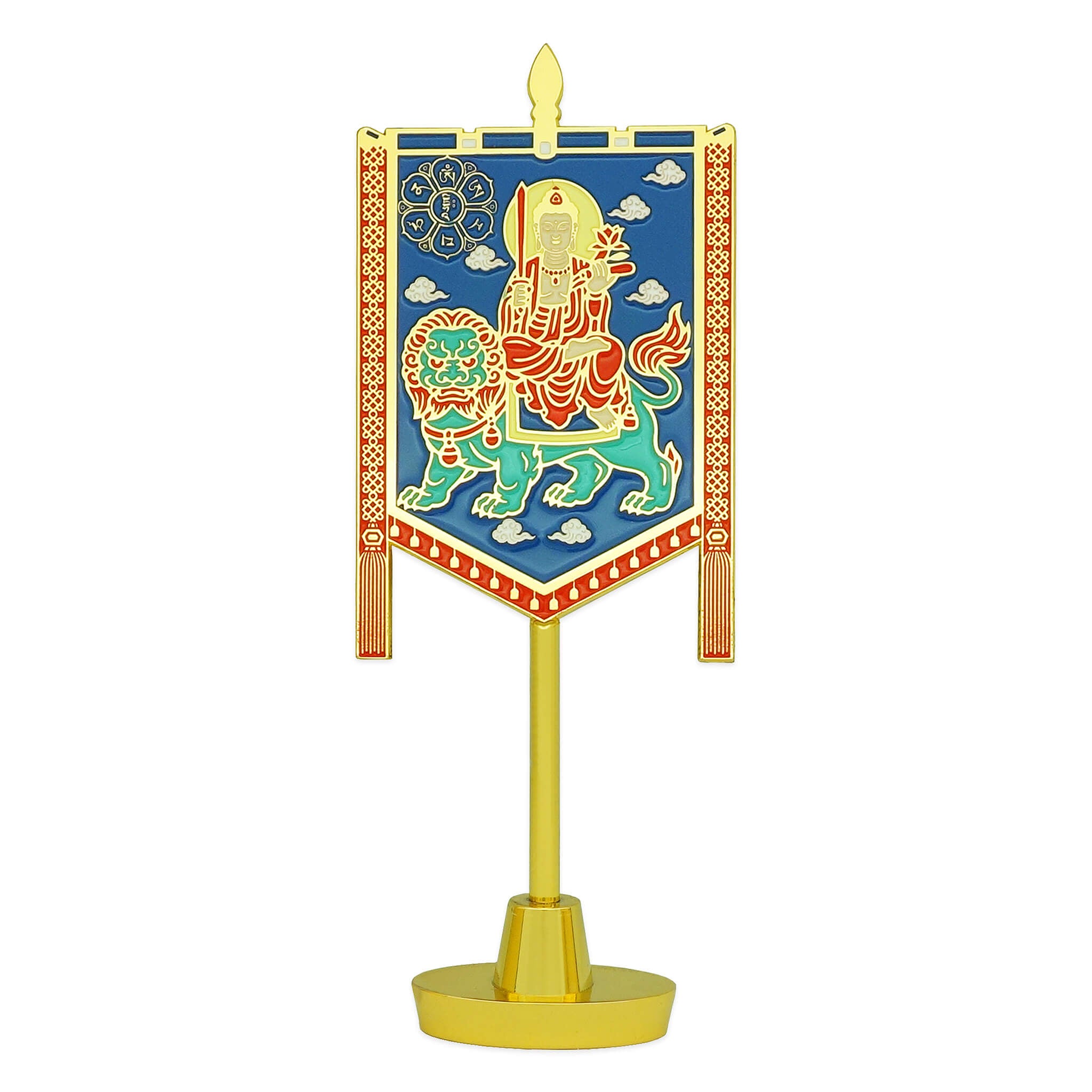 The front features Manjusri seated on his celestial lion, symbolizing courage, clarity, intelligence, and absolute victory over obstacles. His presence helps you: