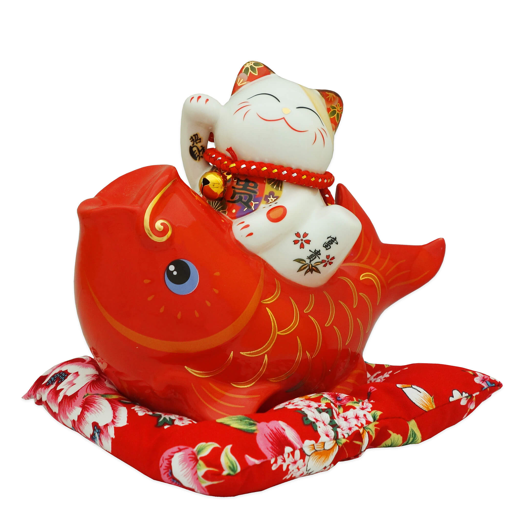 This beautifully crafted Wealth Cat Riding Fortune Carp is a powerful symbol of wealth, success, and wishes coming true. Finished in auspicious red and gold, the smiling Maneki-Neko sits confidently atop a carp, representing prosperity that rises and flows continuously.