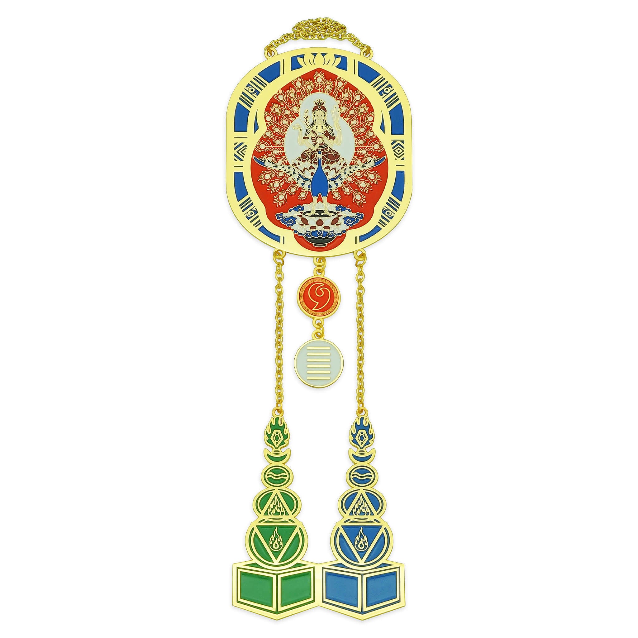 The double pagodas in green (Wood) and blue (Water) reinforce the Metal energy contained in gold. Together they form the most powerful combination to overcome aggressive Earth chi.