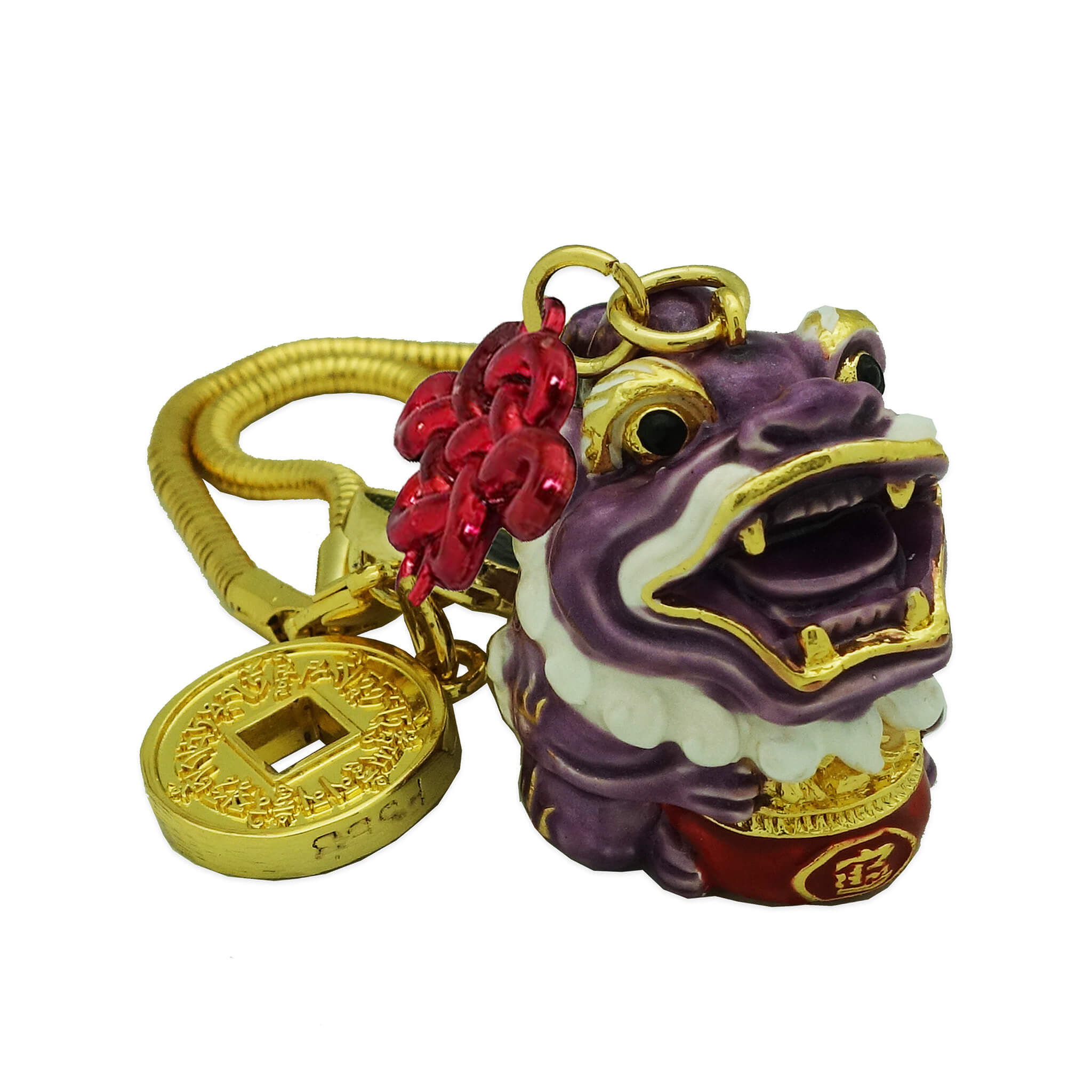 The Pi Yao, a symbolic creature of feng shui, is turned into a legend in this premier quality masterpiece. The Pi Yao can be protective, greedy, or lovable, displaying all the facets of its liberated personality from one year to the next. This brilliant design features a fat "Pi Yao clutching a Wealth Pot", connoting an abundant catch of wealth. No financial opportunity will slip by or be left uncaptured. This Pi Yao will harness prosperity, increase happiness, generate opportunities and usher in money. Empowering the amulet is the mantra coin inscribed with sacred mantras of good fortune, immunity against loss and shielding off dark forces. They are the mantras of Avolekitesvara, Yellow Jhambala and Goddess of White Umbrella. These sacred mantras provide a special channel to the cosmic realm to invoke divine help. Inspired by the need to activate its true potential and power, a shy energy infused tag is hidden under an exquisite pendant of the mystic knot.